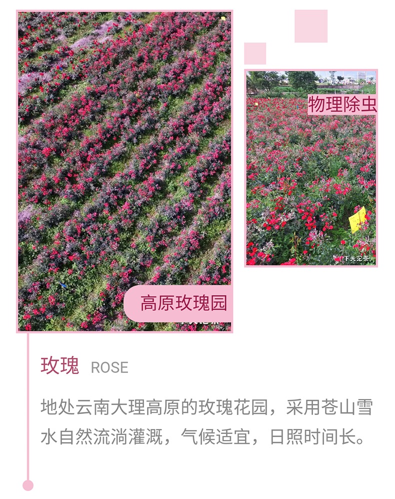 地处云南大理高原的玫瑰花园,采用苍山雪水自然流淌灌溉,气候适宜,日照时间长。